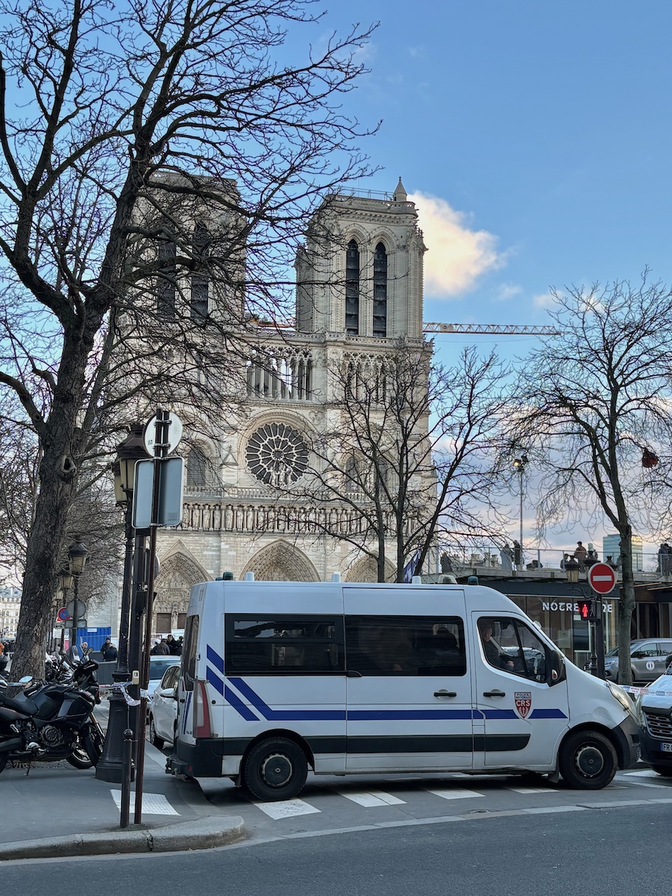 C’est Noël. Le soleil est doux et le froid mordant. Des cars de flics quadrillent les abords de la cathédrale Notre-Dame. Ils semblent avoir été posés là pour remplacer les blocs de béton et de granit qui protègent habituellement les lieux touristiques des « voitures folles » et des « camion fous », lesquels pourront donc éventuellement s’écraser sur des fonctionnaires oisifs plutôt que sur ces blocs inertes en cas d’attaque.